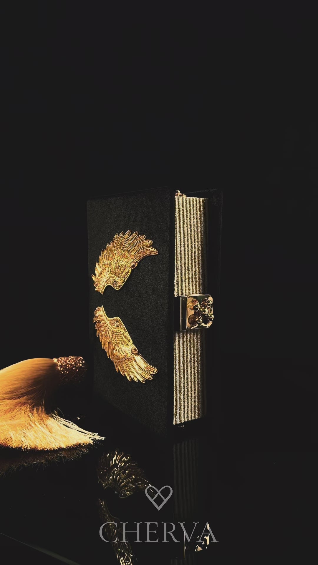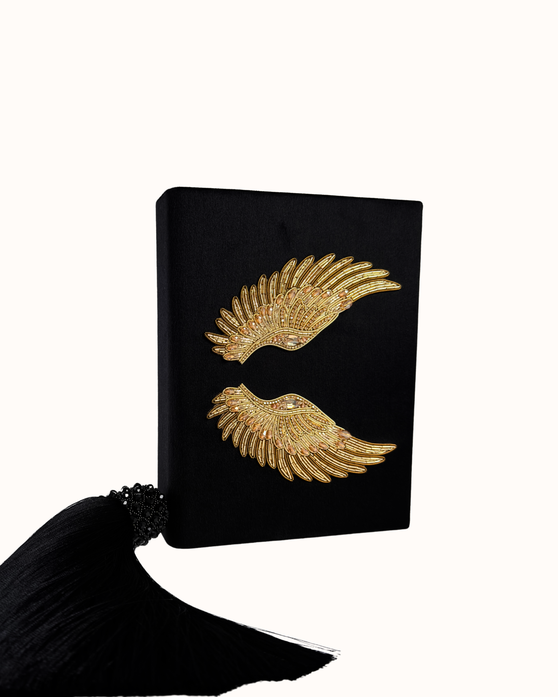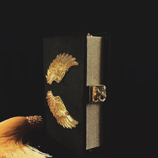 Глибокий чорний оксамит стає фоном для розкішної ручної вишивки у формі золотих крил — витончених, деталізованих, ніби створених для зльоту.