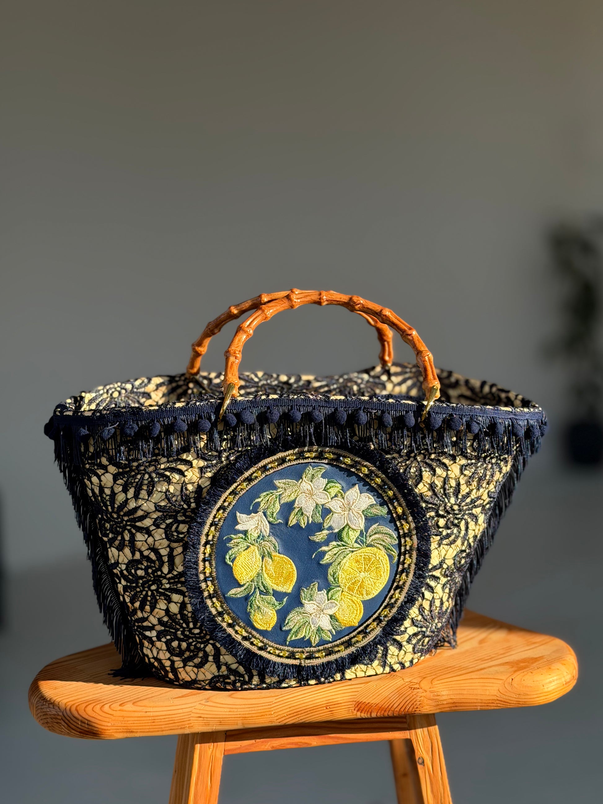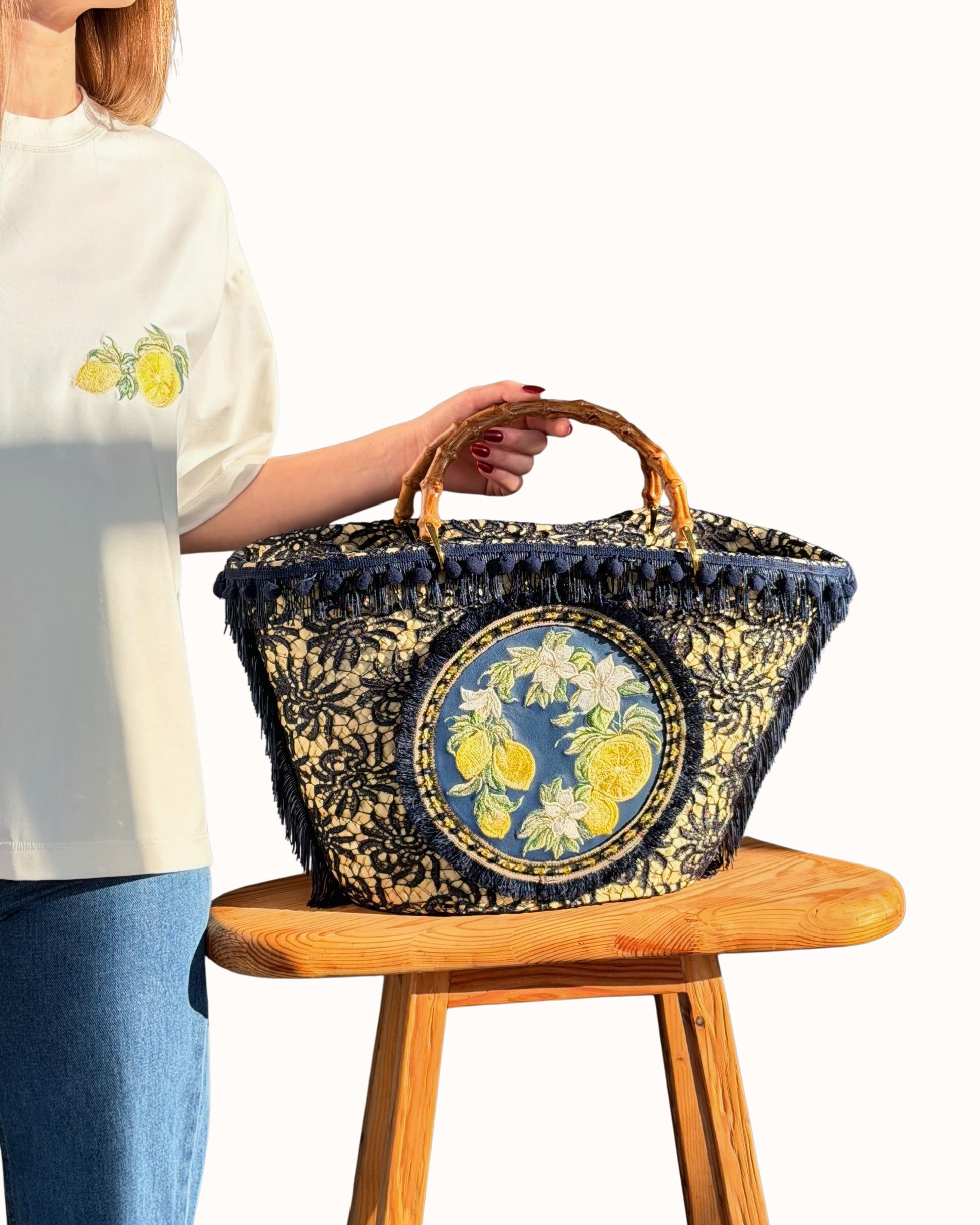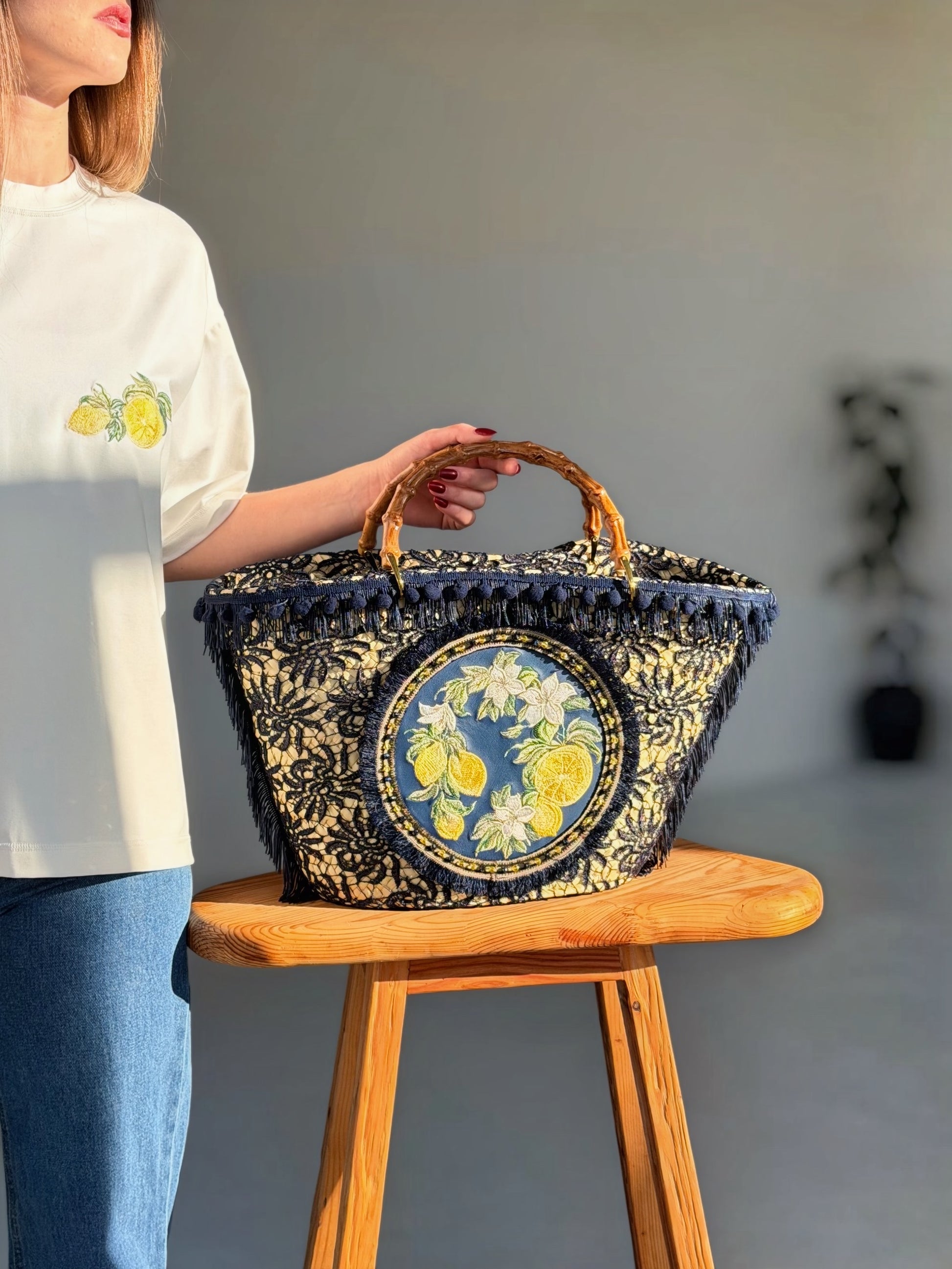 Центральний акцент — вишитий медальйон із лимонами та квітами цитруса, символами достатку, енергії та радості життя. Насичений жовтий колір додає образу світла і тепла, нагадуючи про сонце, літо та подорожі.