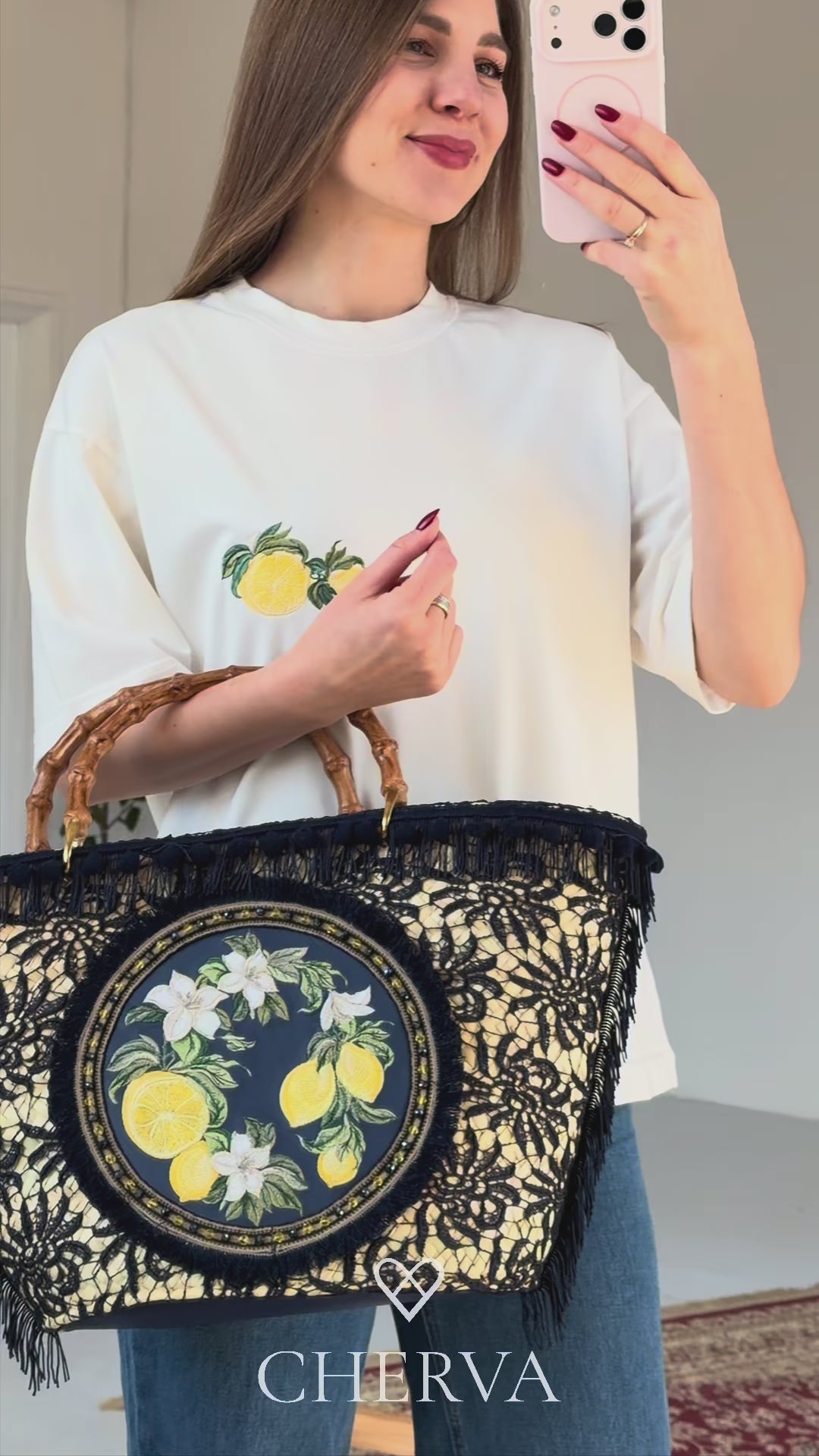 Основа сумки виконана з натуральної мараканської соломи, відомої своєю міцністю, легкістю та природною текстурою. Декорована витонченим чорним мереживом і бахромою, вона поєднує в собі етнічну естетику та елегантність.