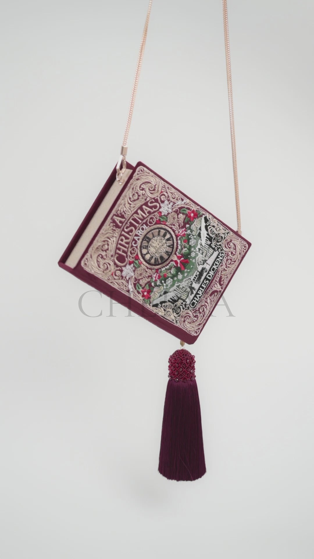 • Ви можете обрати один із трьох варіантів каркаса: оксамитовий, з еко-шкіри або з вишитими золотими сторінками (100 000 стібків, які відшиваються протягом 6 годин, щоб перетворити клатч у справжню книгу).