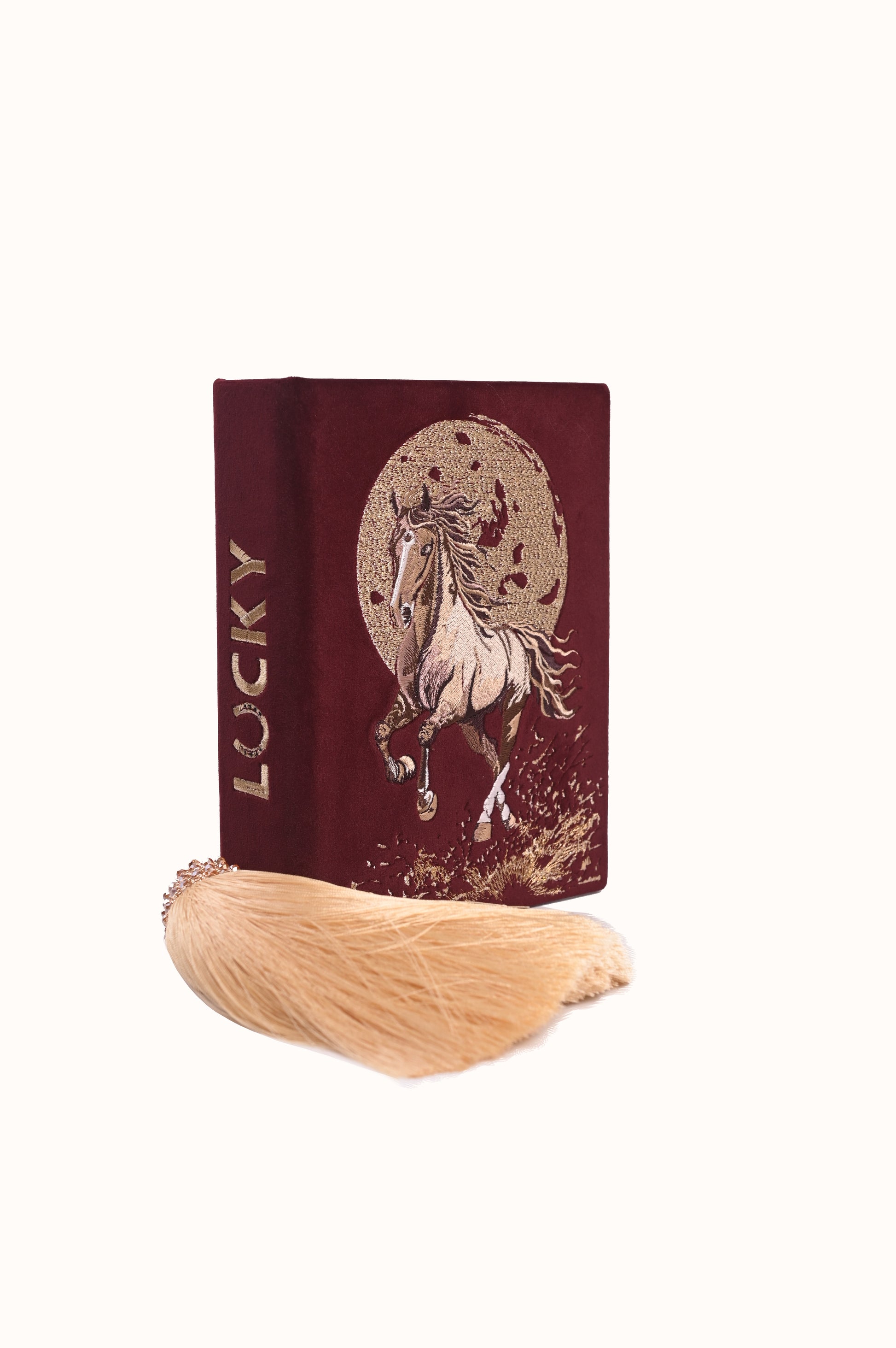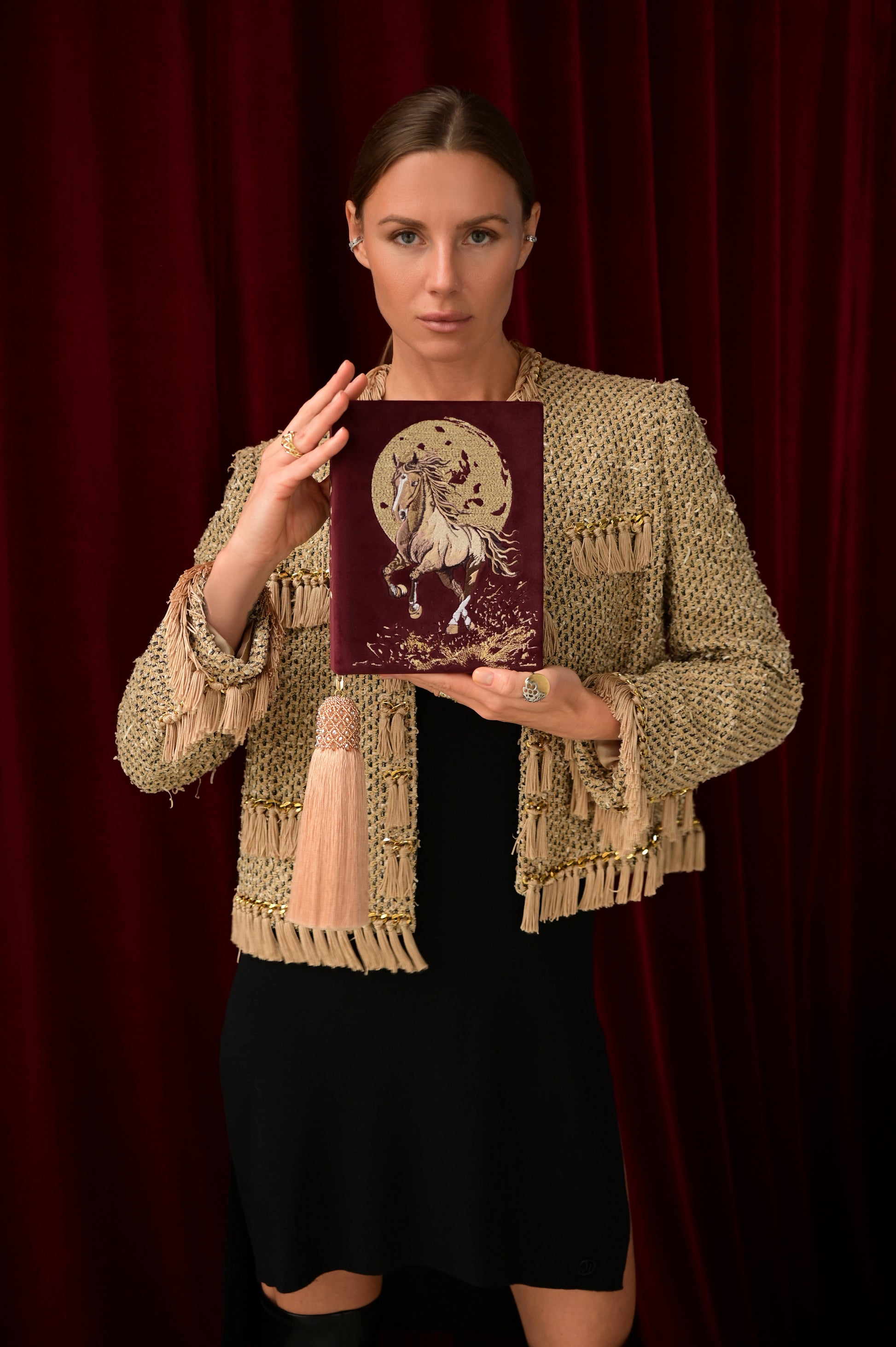Обкладинка: глибокий бордовий оксамит із деталізованою вишивкою, що зображує коня на тлі золотавого місяця — символу внутрішнього світла, мудрості та гармонії.