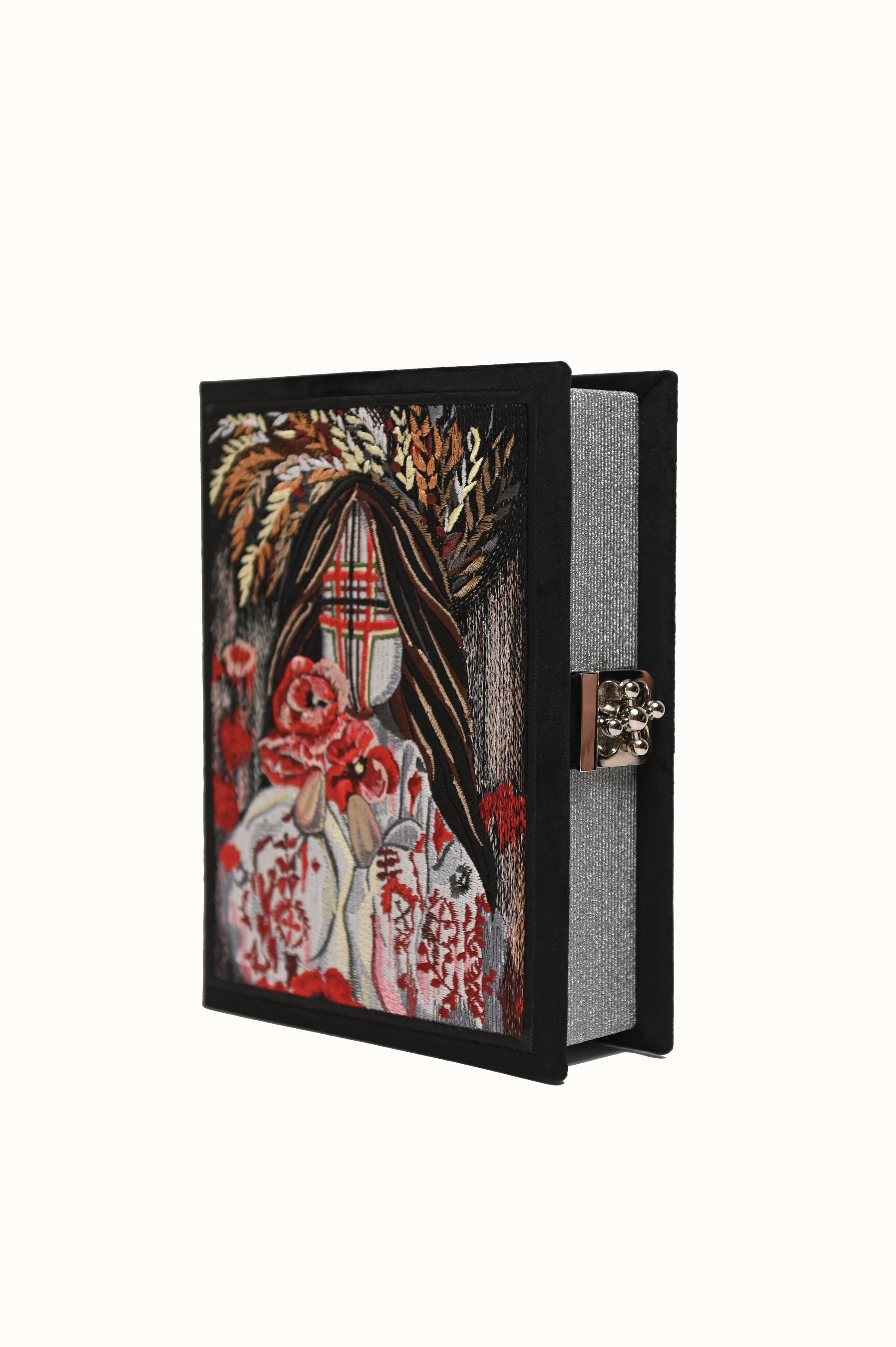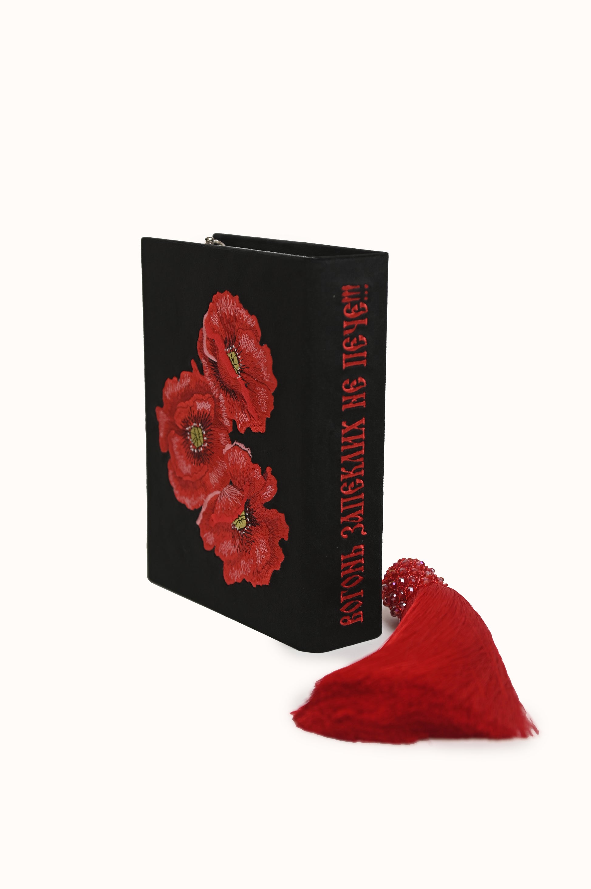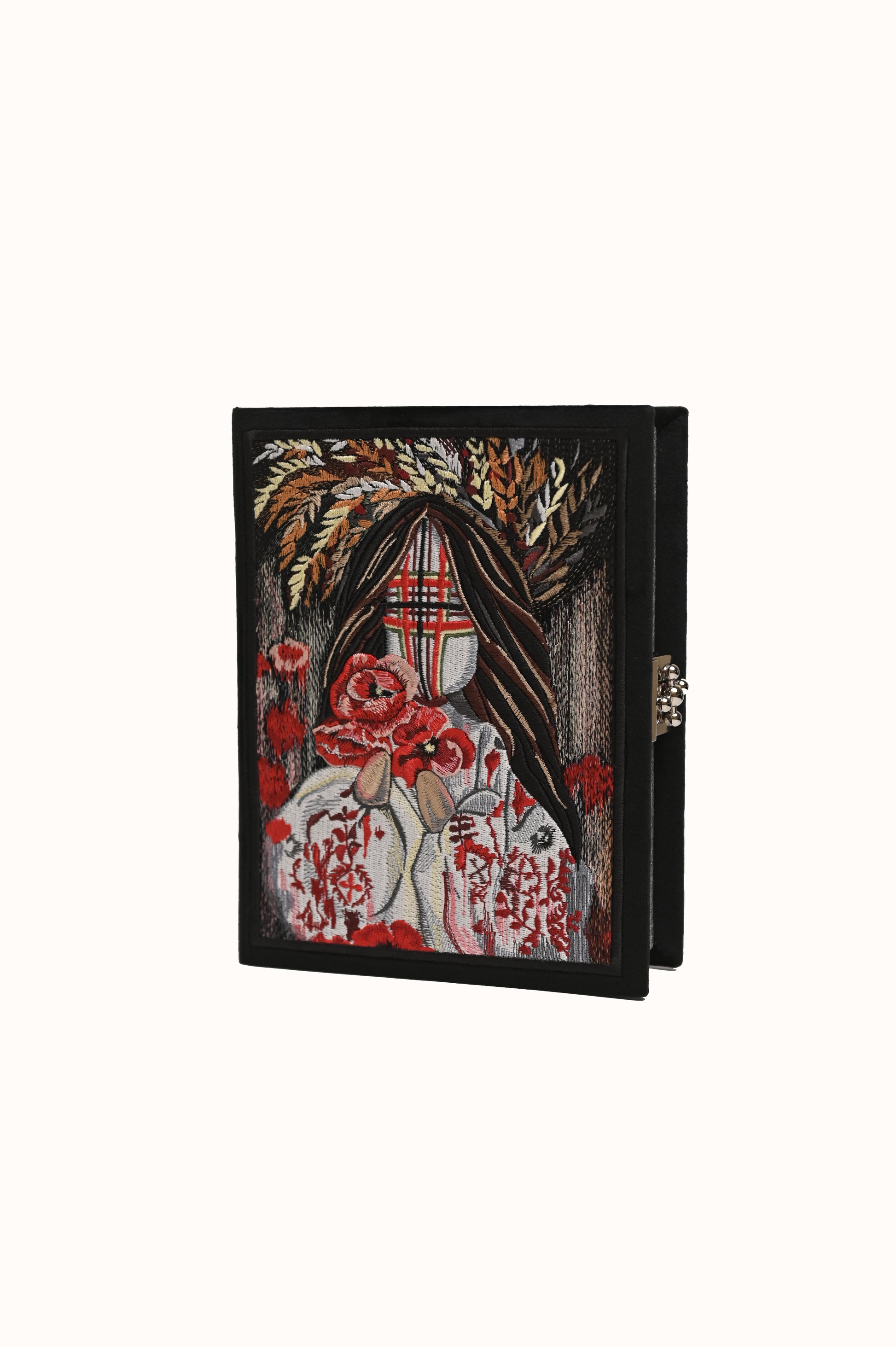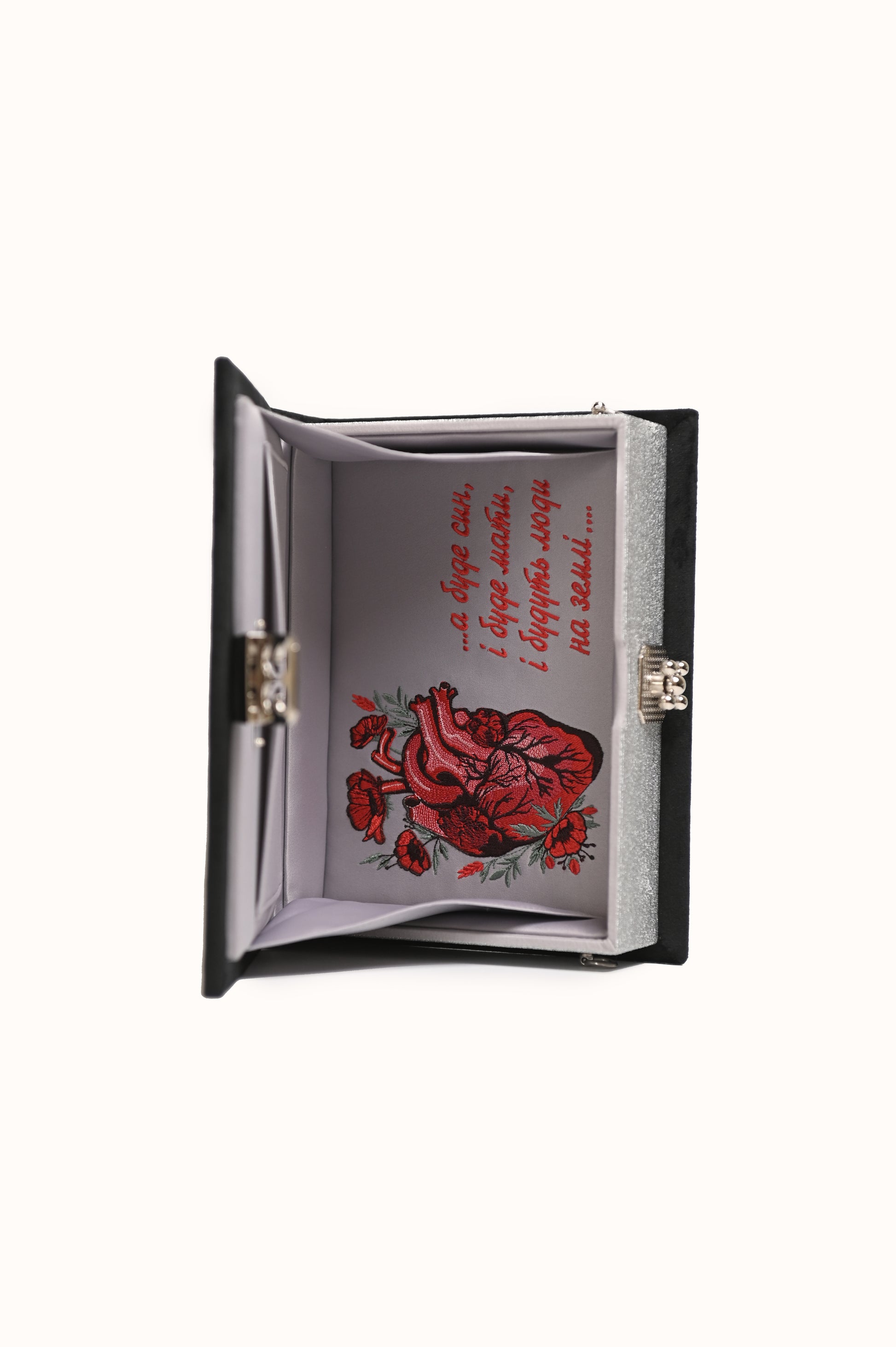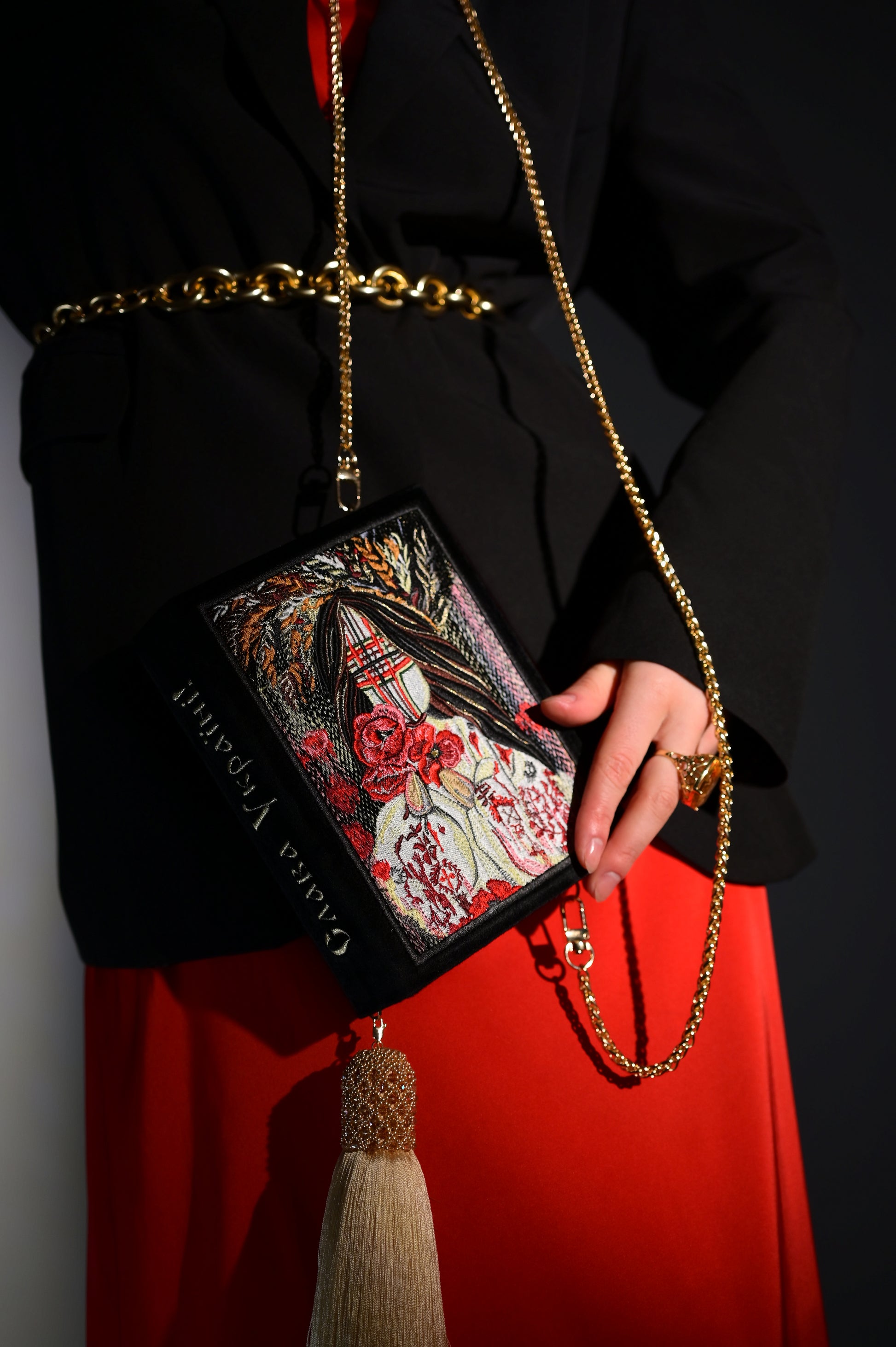 Три варианта каркаса на выбор: бархатный, из эко-кожи или вышитые золотые страницы — авторская технология бренда CHERVA, создающая реалистичные книжные страницы, делающие клатч уникальным и символичным.