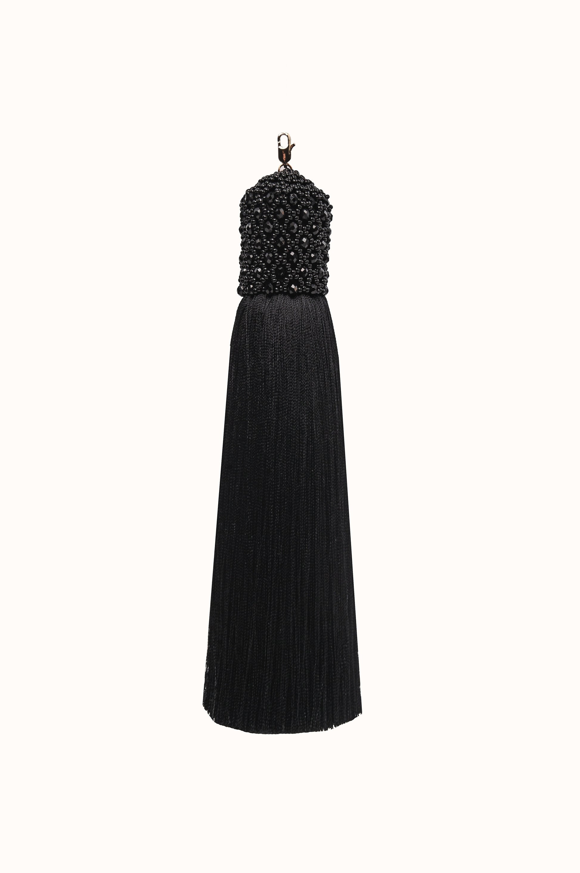 Шелковая кисть на ювелирном карабине, украшенная хрустальными бусинами, играет роль книжной закладки и придает клатчу изысканности.